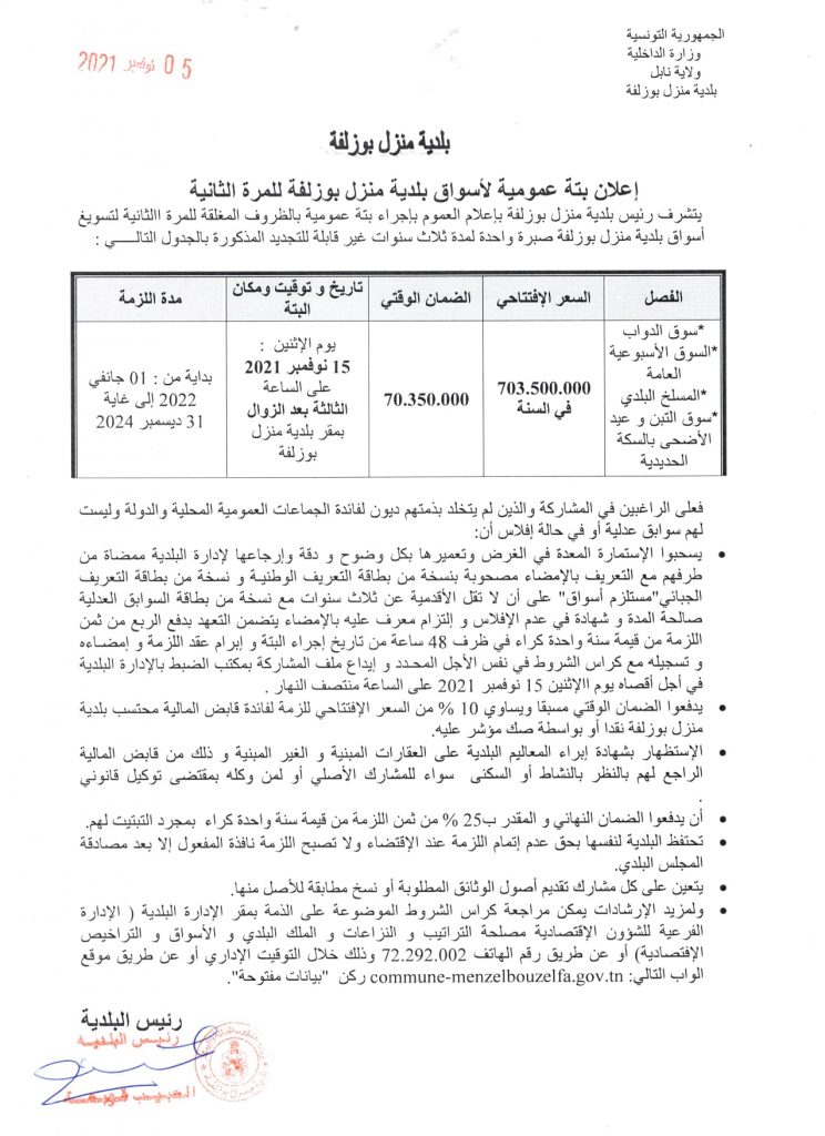 إعلان بتة عمومية لأسواق بلدية منزل بوزلفة للمرة الثانية لمدة ثلاث سنوات بداية من 01 جانفي 2022